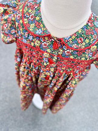 Pattern: Ruthie + Smocked Ruthie Add-on Fabric: Emma Louise B by Liberty of London Piping: Imperial Batiste Red by Spechler Vogel Smocking Plate: Variation of Sydney Nicole by Peanut Butter Jelly DMC Floss: 347 (Purchase Match Your Floss and note this number.)