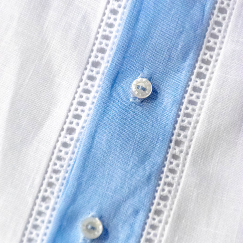 One of our favorite parts of Sutton is its versatility. In this adaptation, see how we add a sweet touch of blue to the white linen daygown. Changing the fabric for the facing also allows you to add the Swiss insertion for added interest. The sweet ideas are endless.